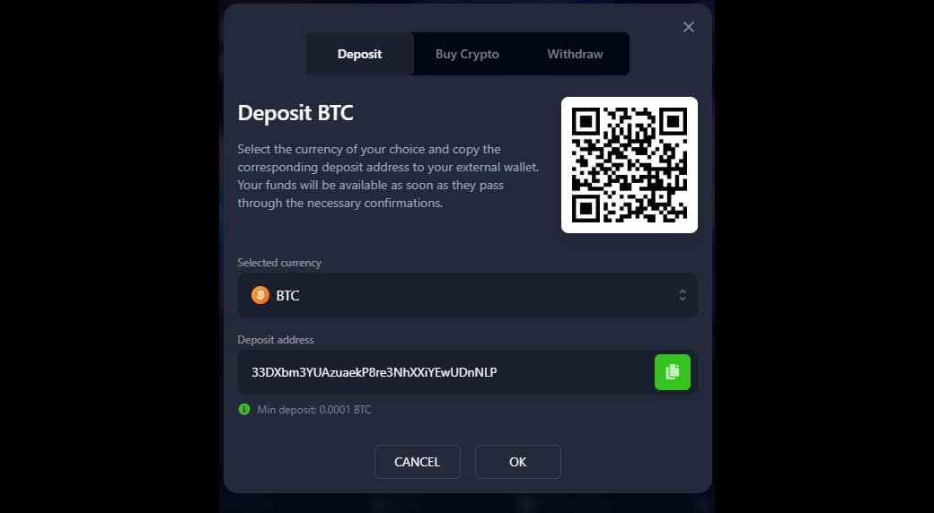 Select the crypto you wish to deposit with and enter the amount you wish to deposit along with the bonus code.