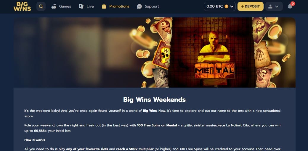 Play any favorite slot game and get 100 free spins on the Mental slot by Nolimit City. To qualify for this bonus, reach a 500x multiplier or higher on any slot game in the BigWins lobby. You can claim this offer once per day, every Friday, Saturday, and Sunday, with no rollover!